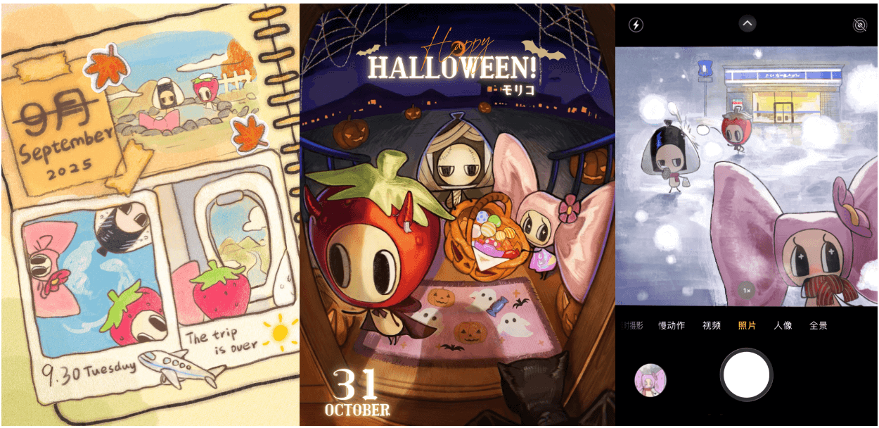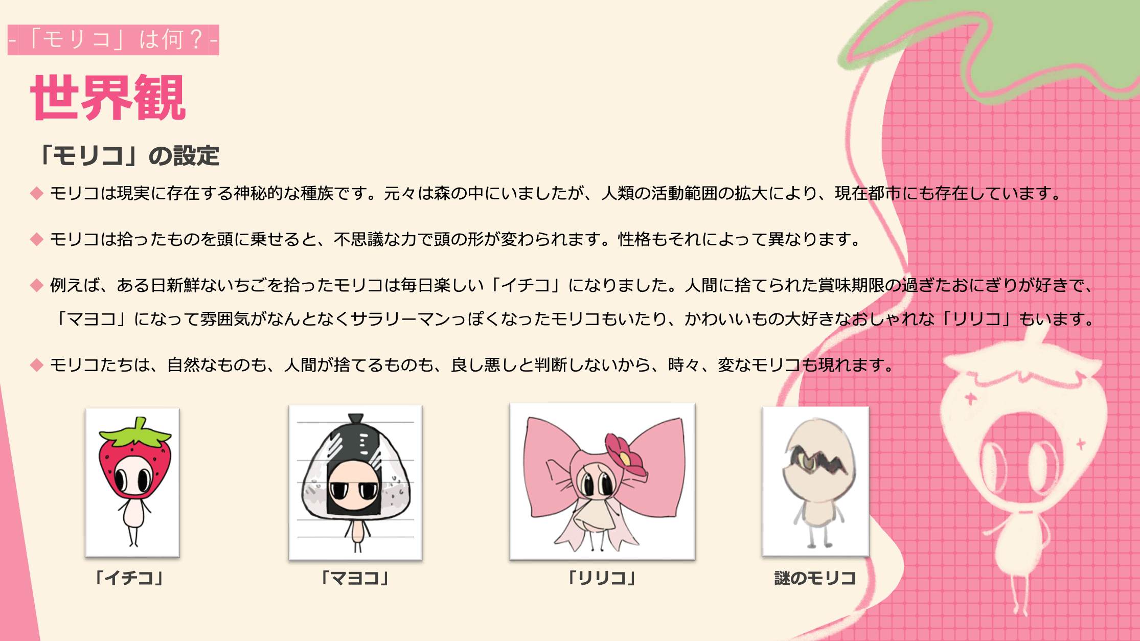 「拾ったもの」を頭に乗せると、不思議な力によって頭の形が変化します。そのときの形によって性格も少しずつ異なり、同じモリコでもまったく違う印象を与えることがあります。